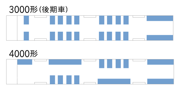 車内のイスに関してですが、3000形の後期車で、新たな試みとして採用されたクロスシート配置ではラッシュ時の混雑が激しくなり、ドア付近に乗客が固まるという難点がありました。更に、短距離利用の乗客にとってはクロスシートは使いづらいものとなりますから、車端部にしかロングシートの無い3000形の配置では乗客によってはサービス向上とは言い難いものでした。こういった点を改善すべく、4000形では下図のような特殊なセミクロスシート配置とし、通路を広くすることでドア付近に乗客が固まるのを防ぎ、ラッシュ時の混雑緩和と閑散時の居住性の両立を図りました。更に、どこのドアから乗ってもロングシートかクロスシートのどちらかを選択できるというメリットも有ります。こういった配置は、他社ではJR東日本の701系・E127系やJR四国1500形7次車にも見られます。